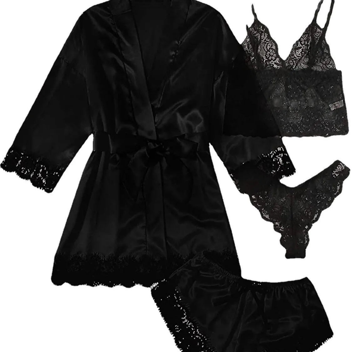 Fashion Sleepwear Four Piece Set, Sexy Lace Trimmed Satin Suspender Set, Dress, Comfortable Casual Nightgown
