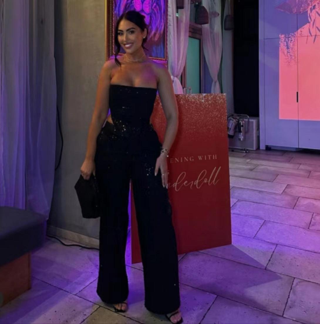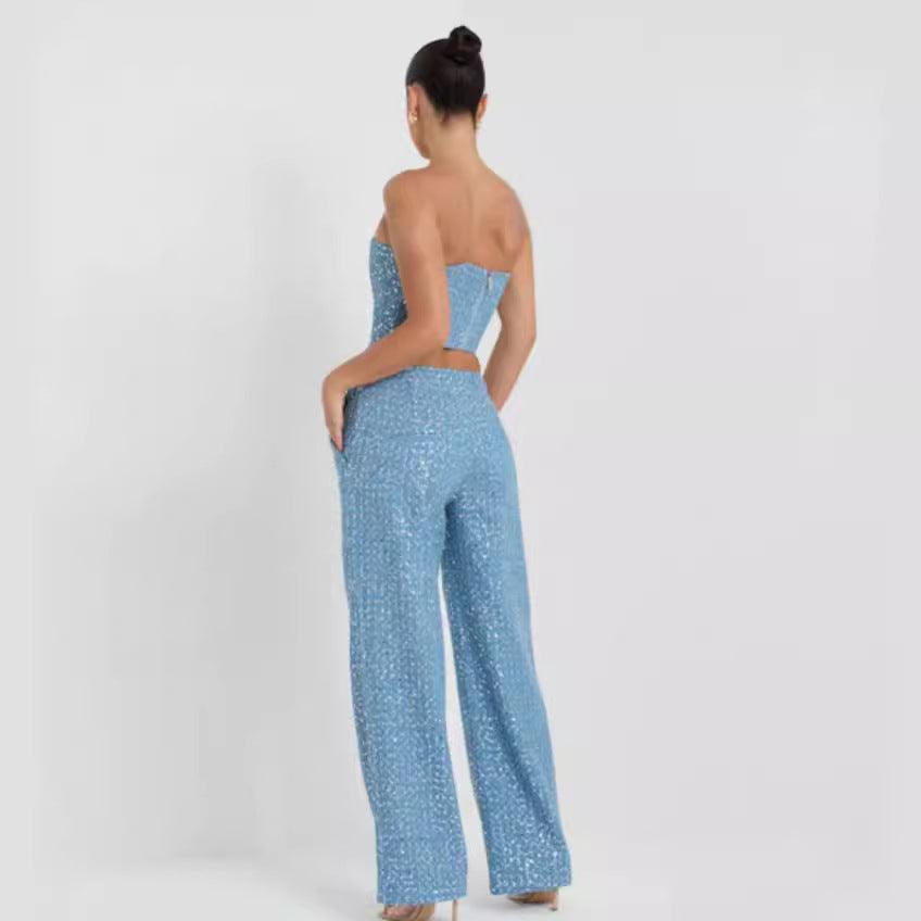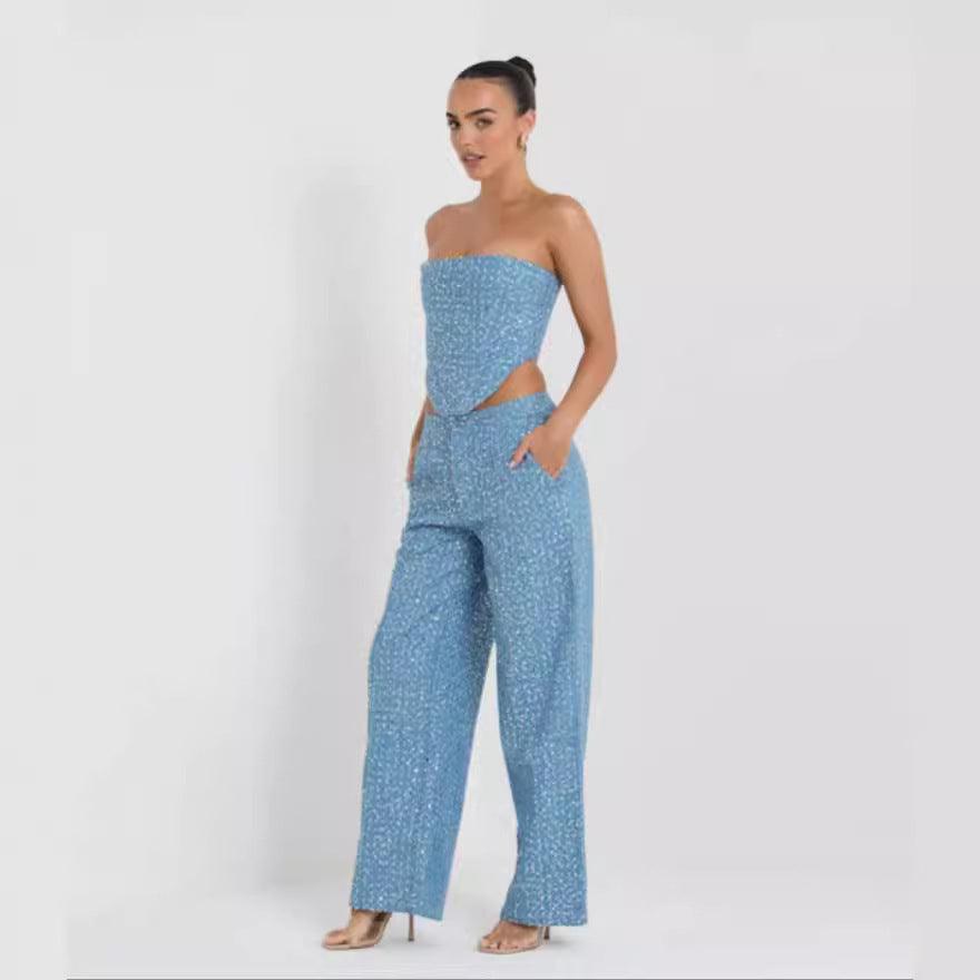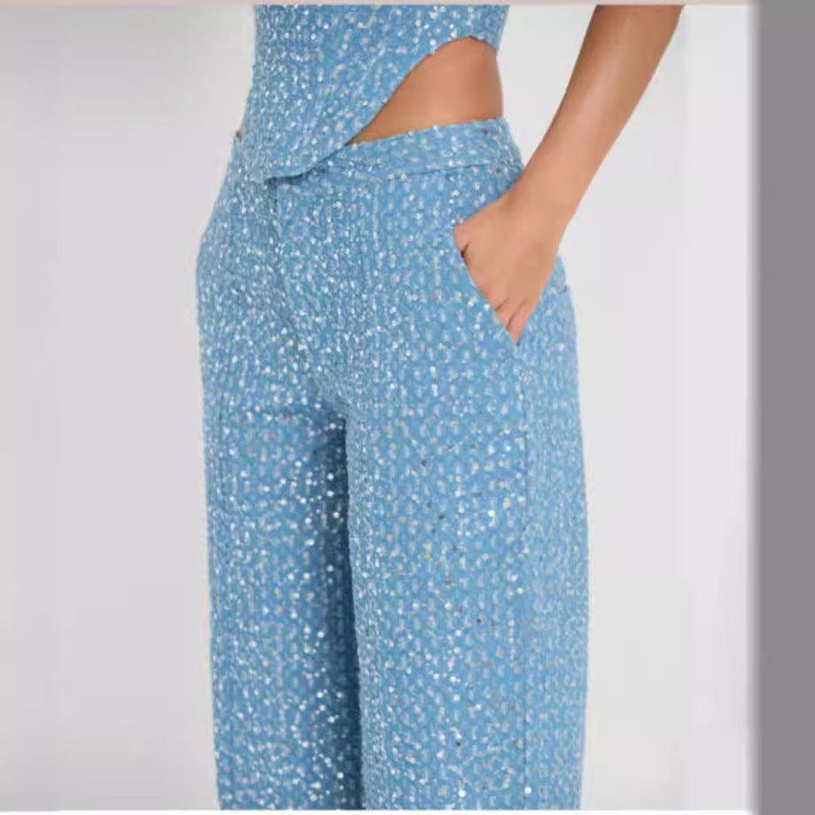 new ing fashion denim sequin spread chest wide leg pants