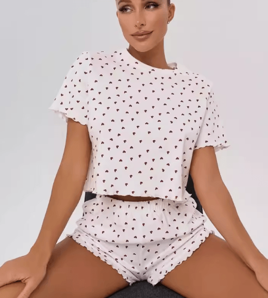 A woman in a two-piece cotton short-sleeved shirt and short