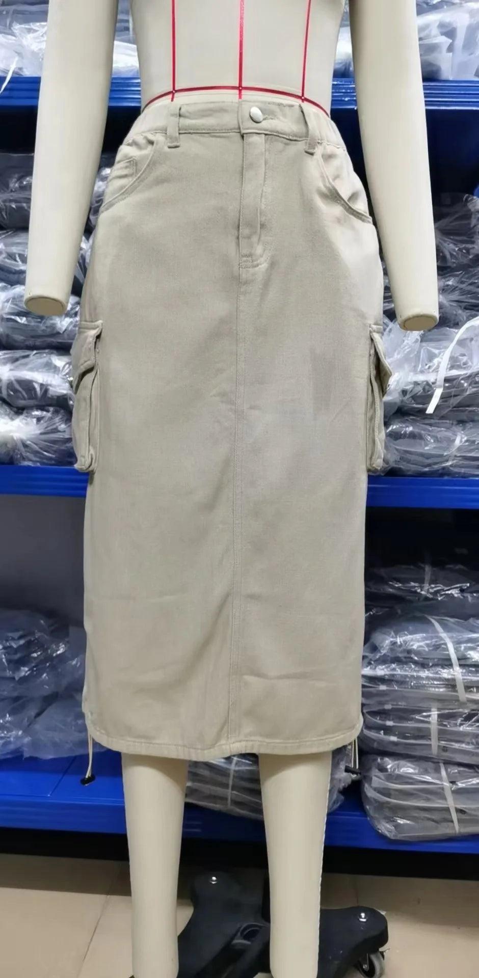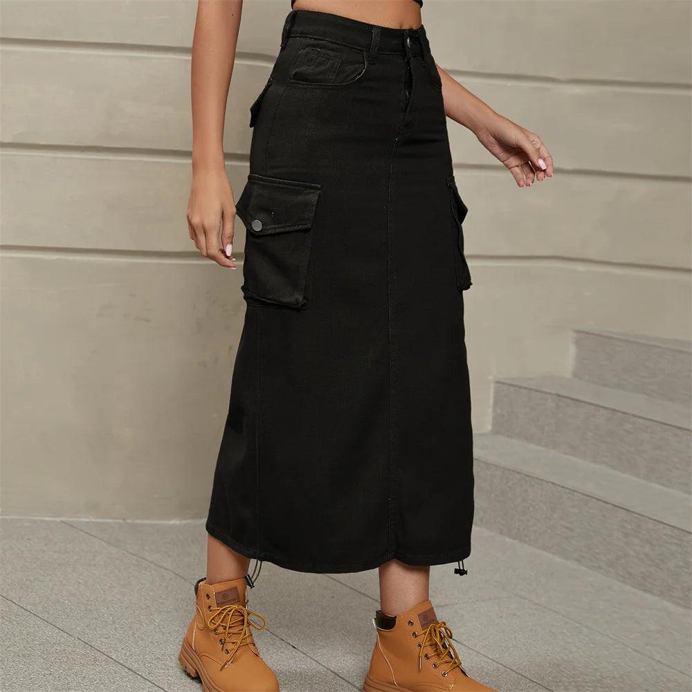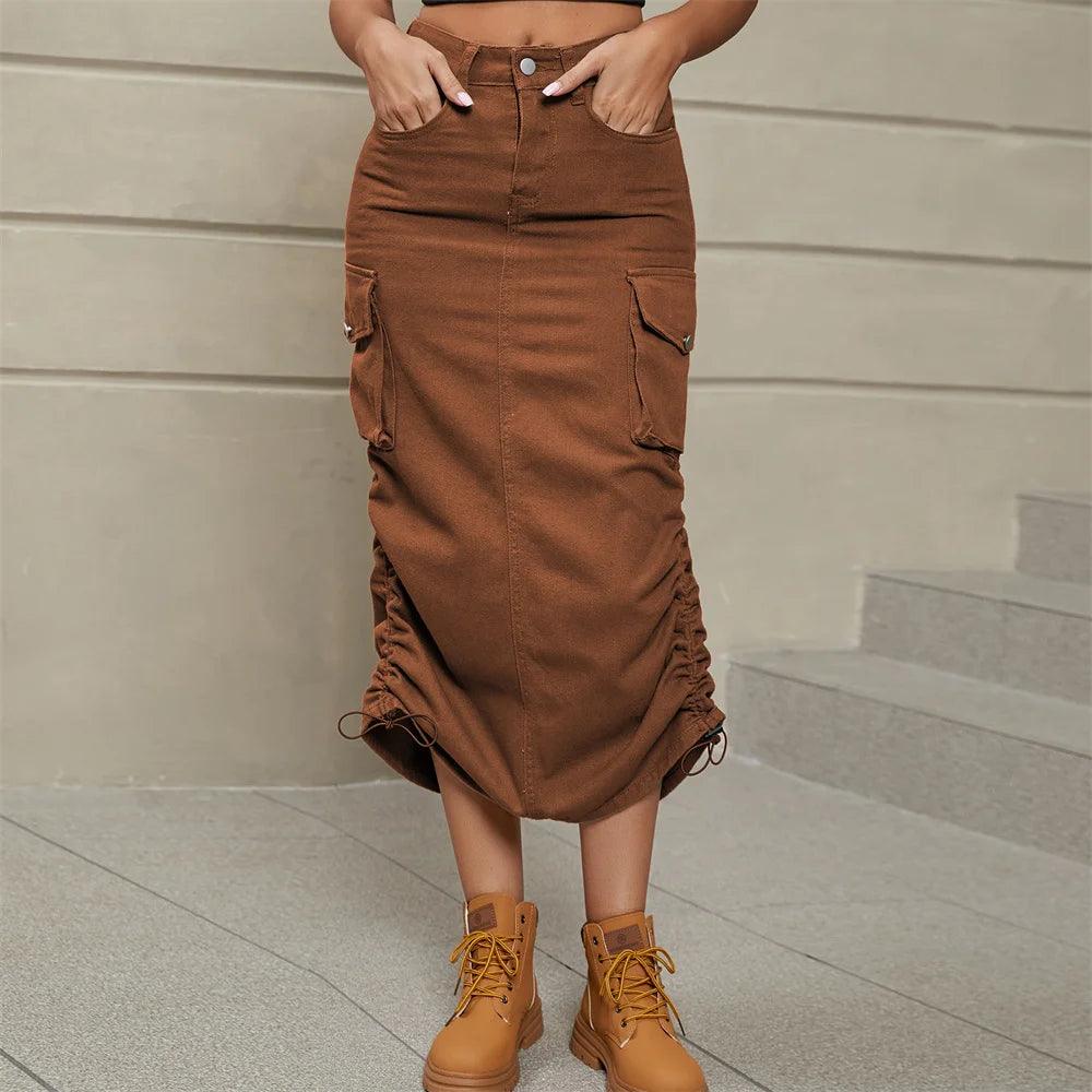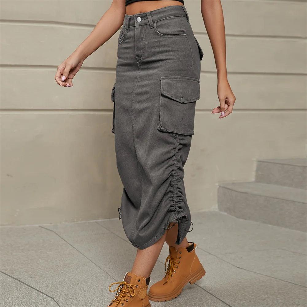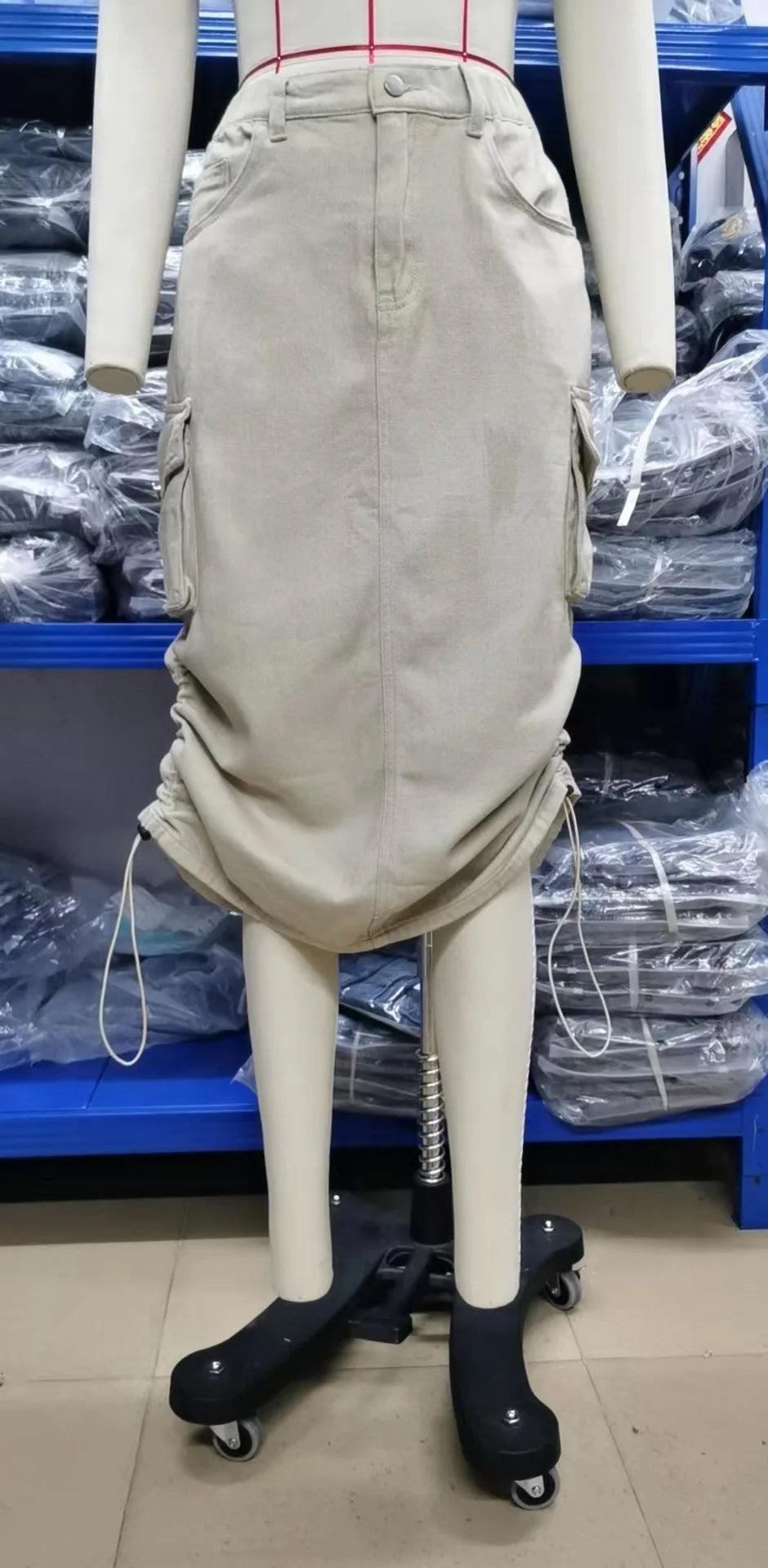 Drawstring Cargo Jean Skirt Fashion Vintage High Waist Straight Long Denim Skirts