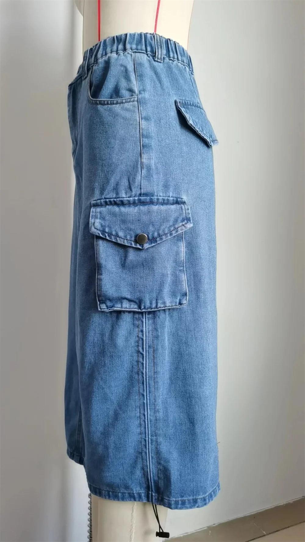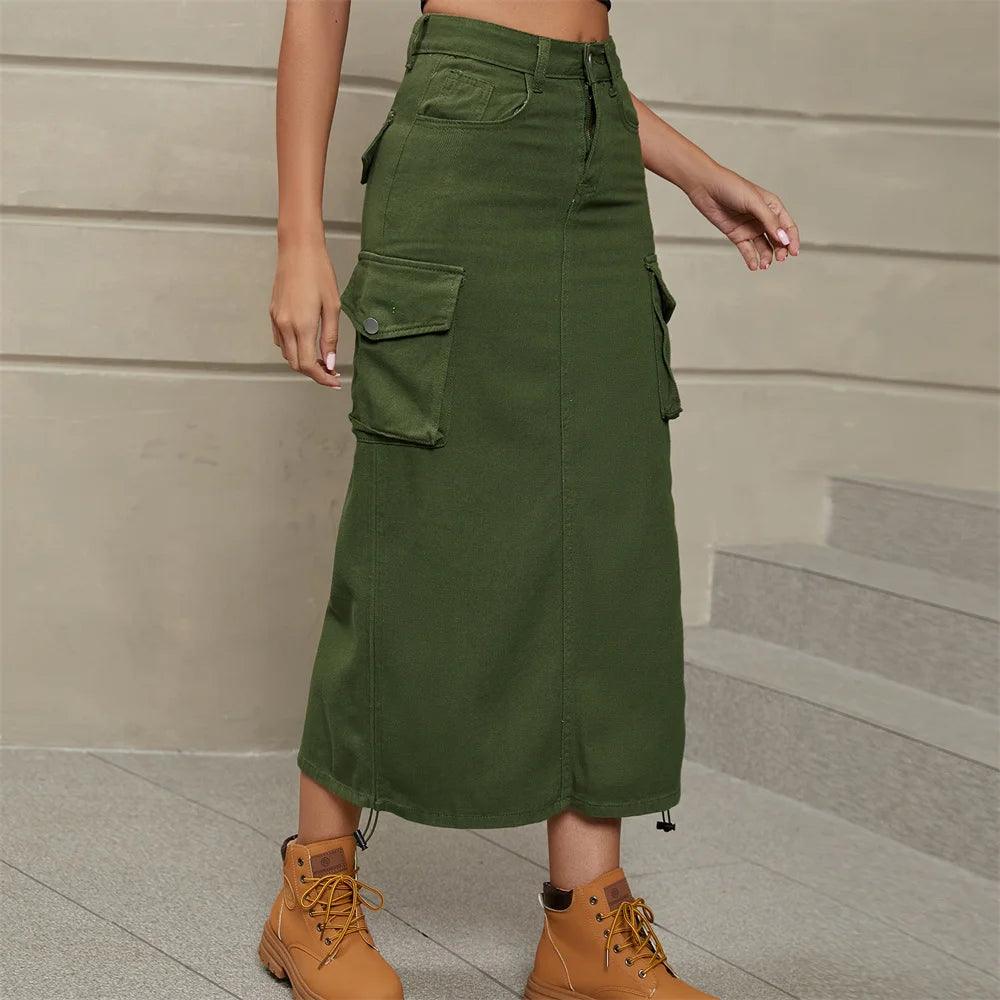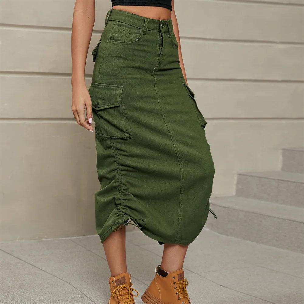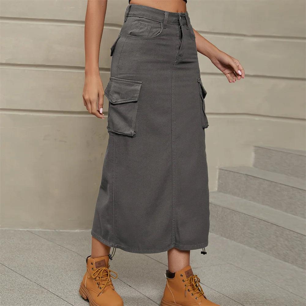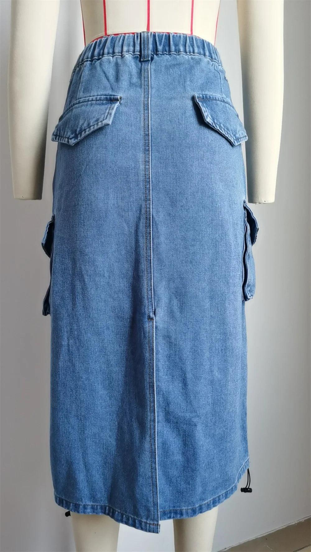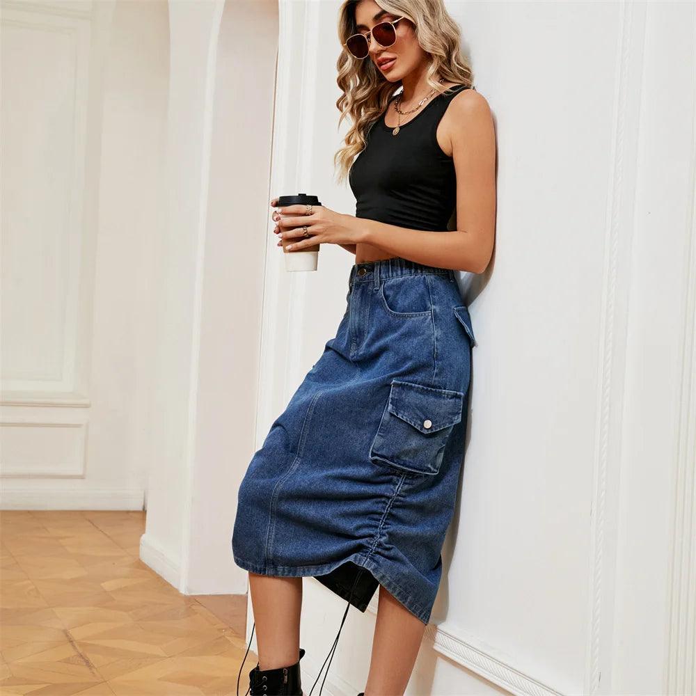 Drawstring Cargo Jean Skirt Fashion Vintage High Waist Straight Long Denim Skirts