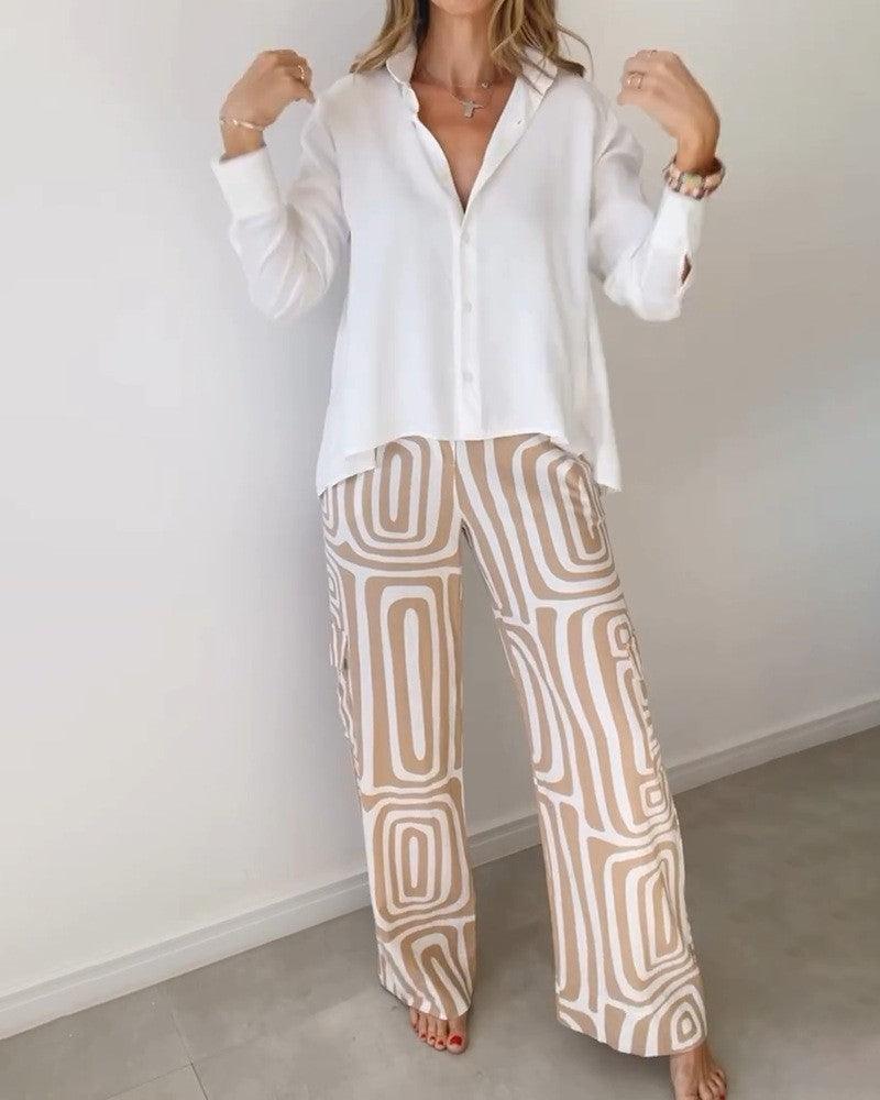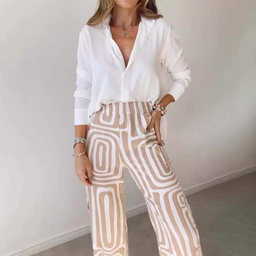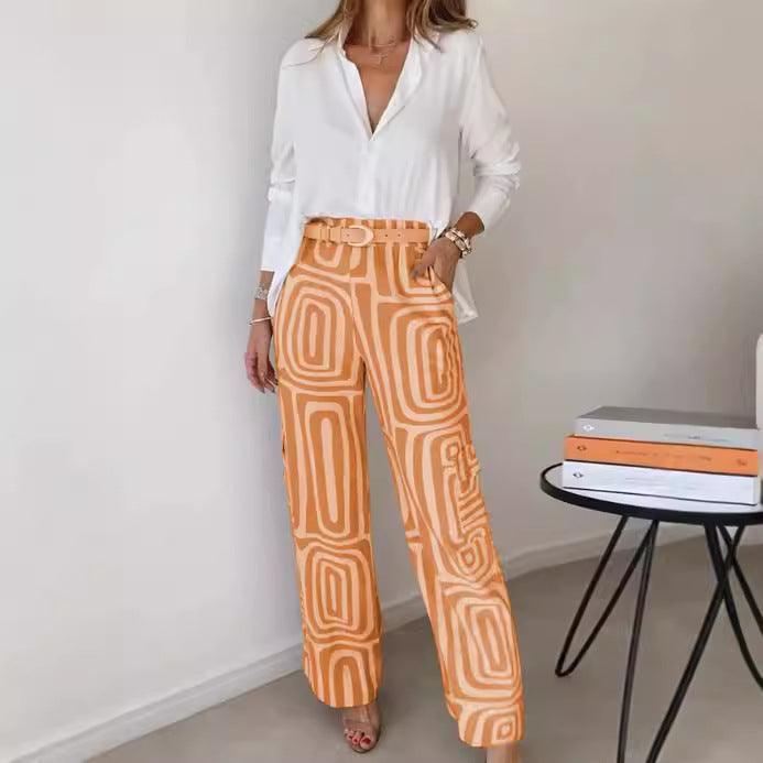 Casual women's digital print commuter shirt loose trousers two-piece set with belt