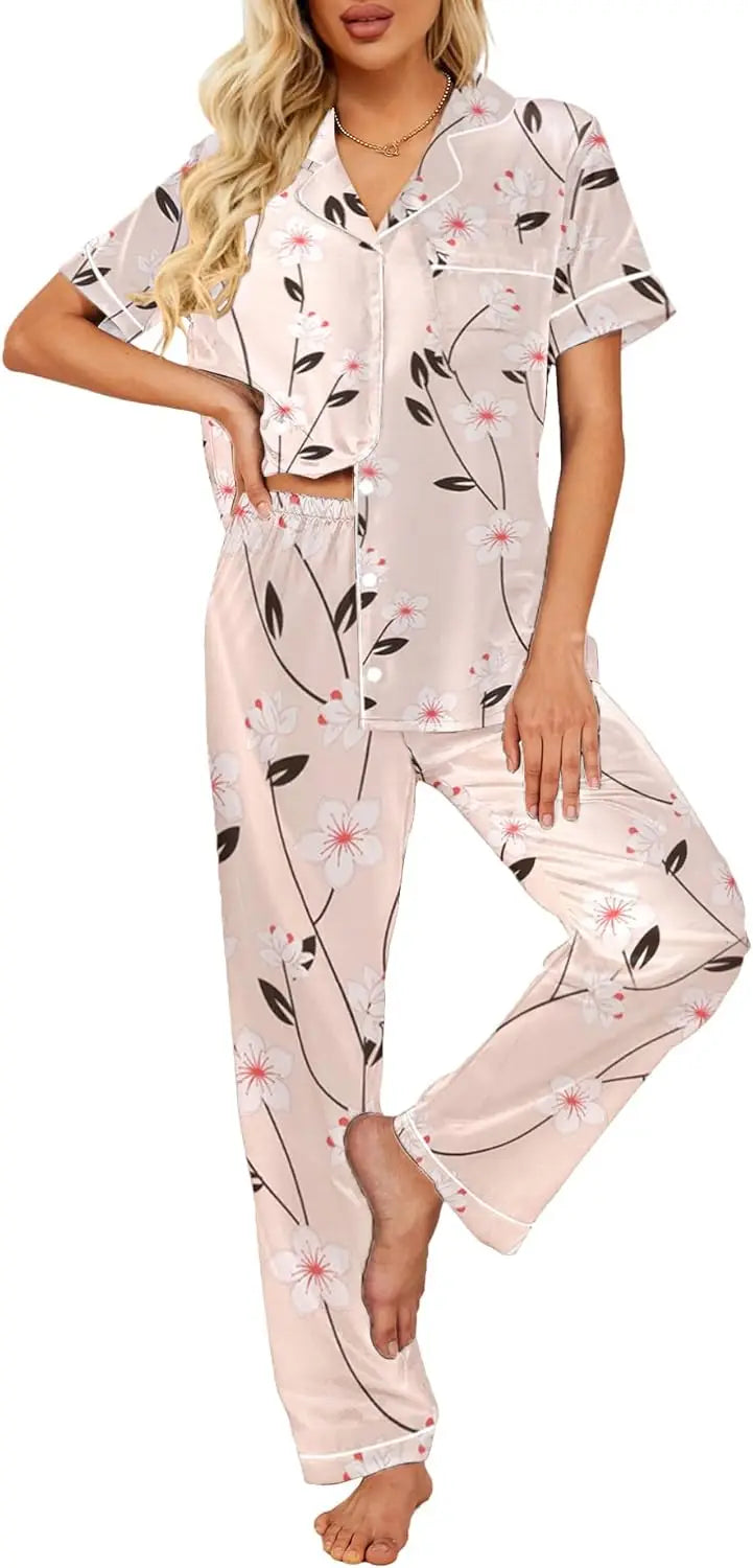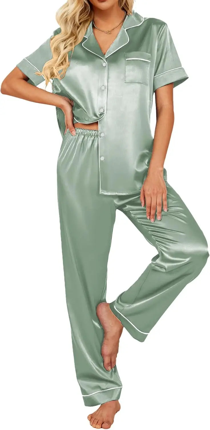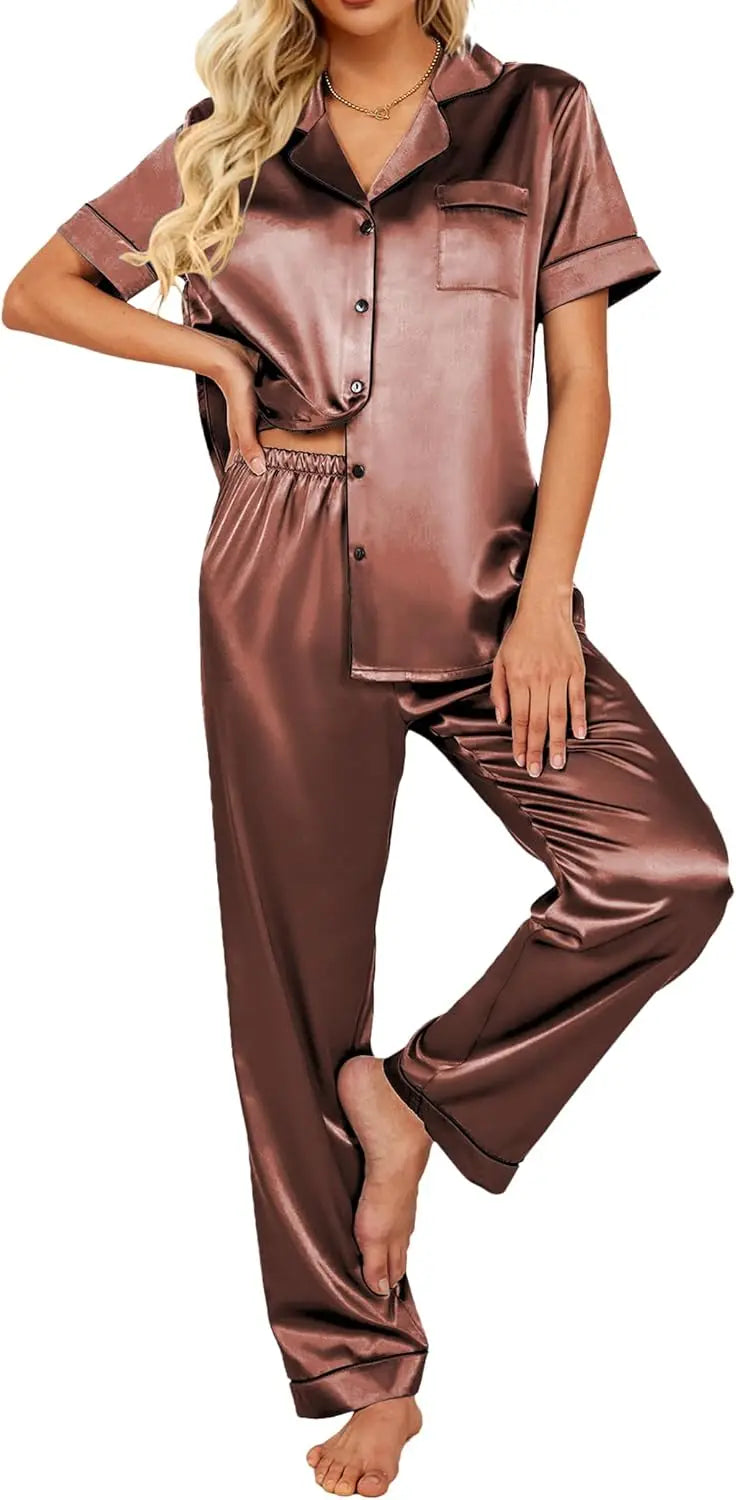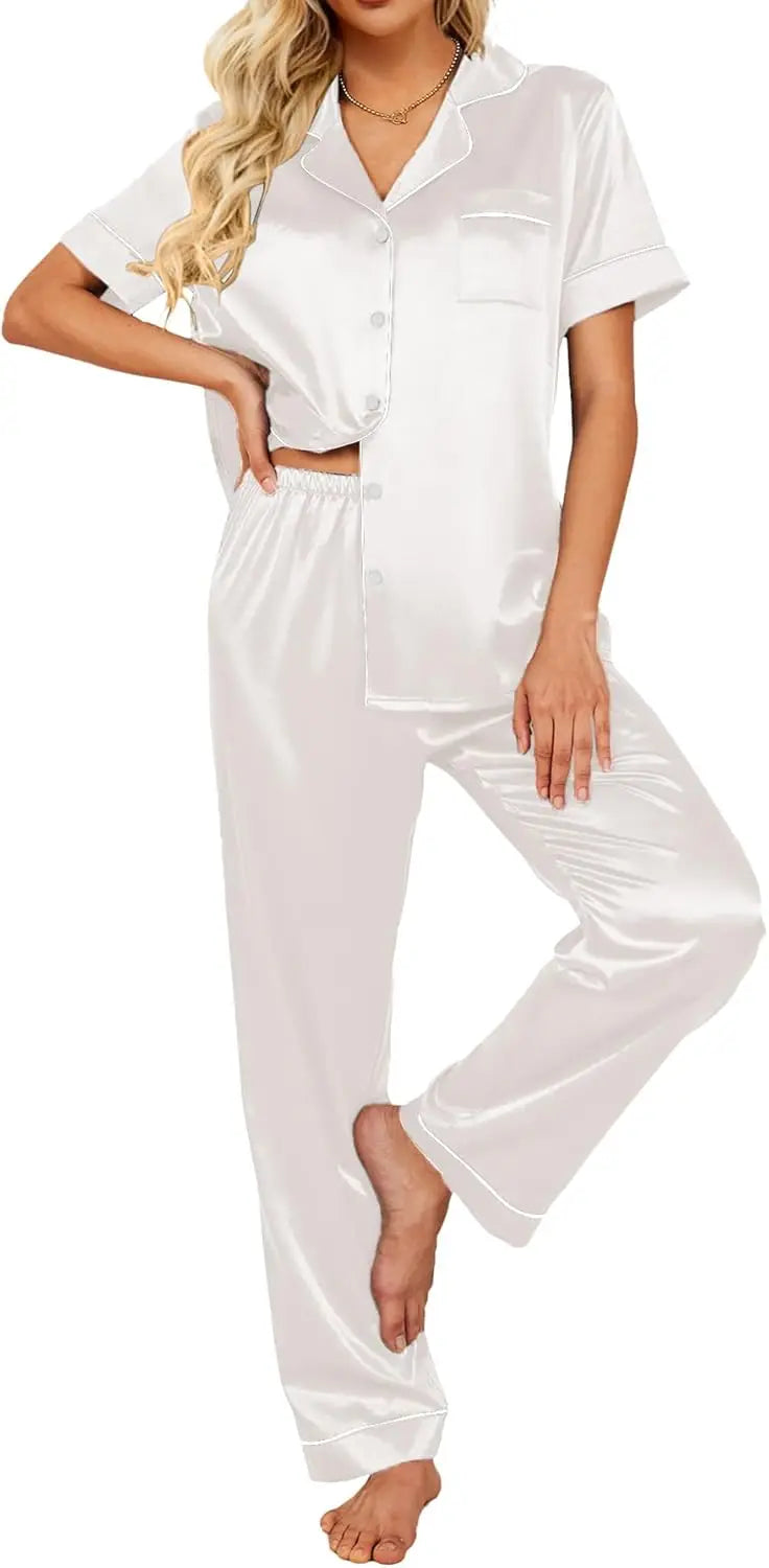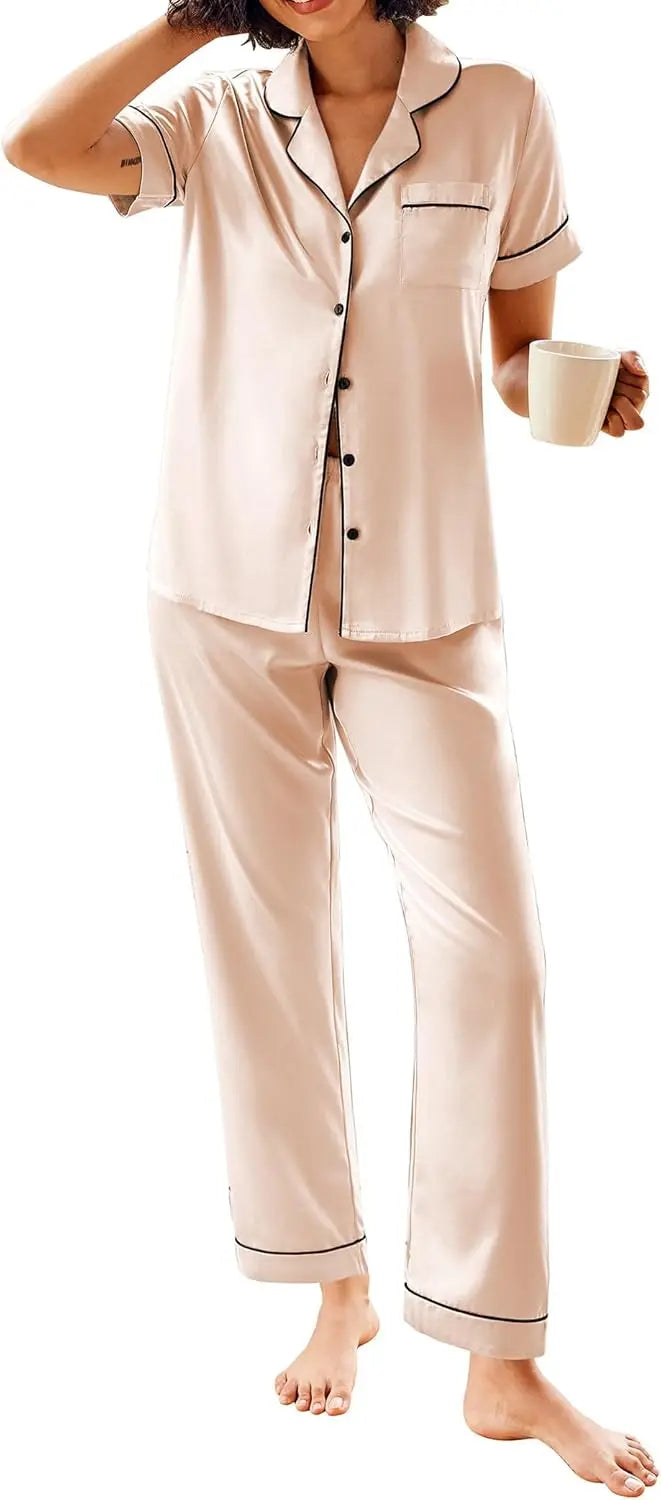 Ekouaer Women's Silk Pajama Set Button Down Short Sleeve Loungewear