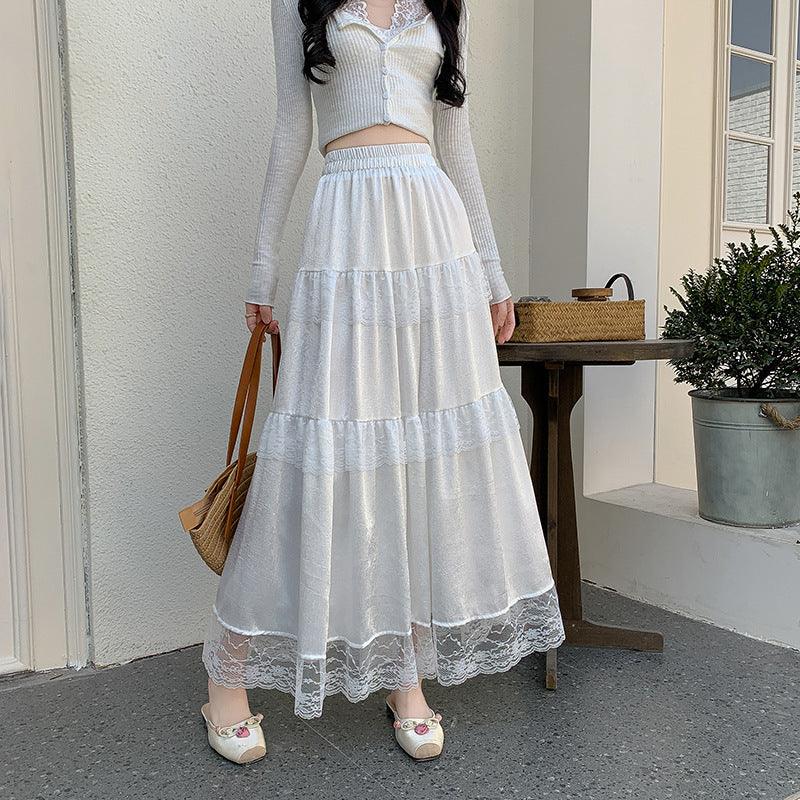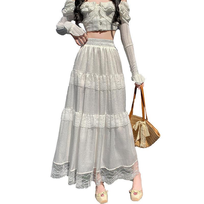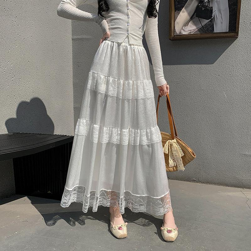 French Style Gentle Ruffled Lace Stitching Tiered Skirt