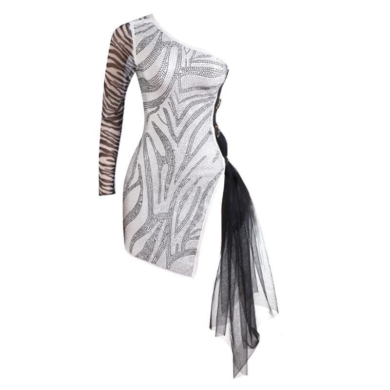 High-grade Black And White Hot Drilling Contrast Color Diagonal Collar Dress