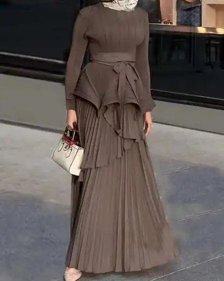 2 Piece Set Women Round Neck Irregular Belt Gathered Waist Solid Long Dresses