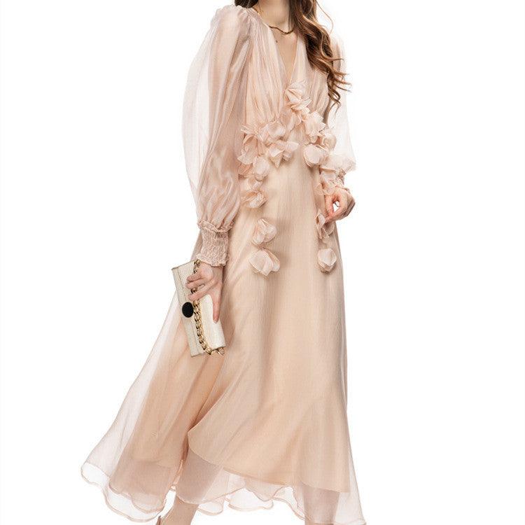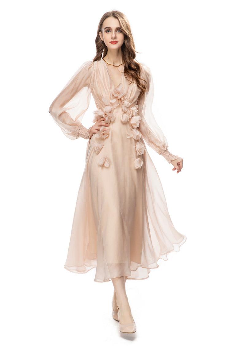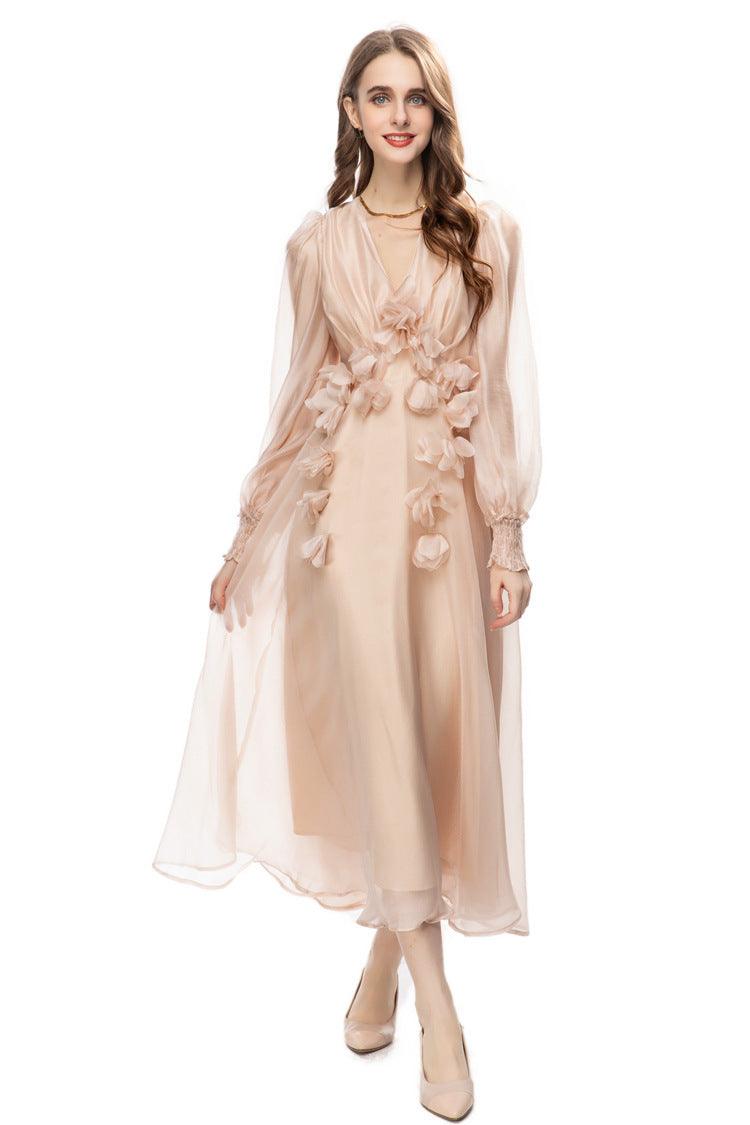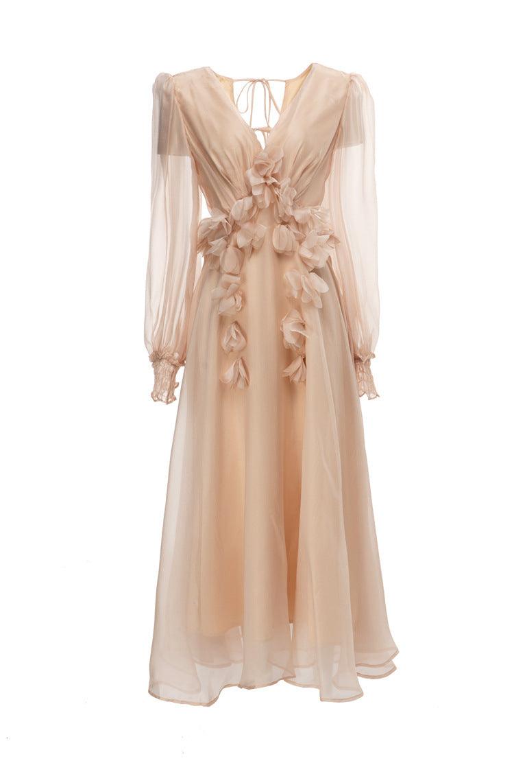 Long Sleeve Three-dimensional Embroidered Backless Voile Dress