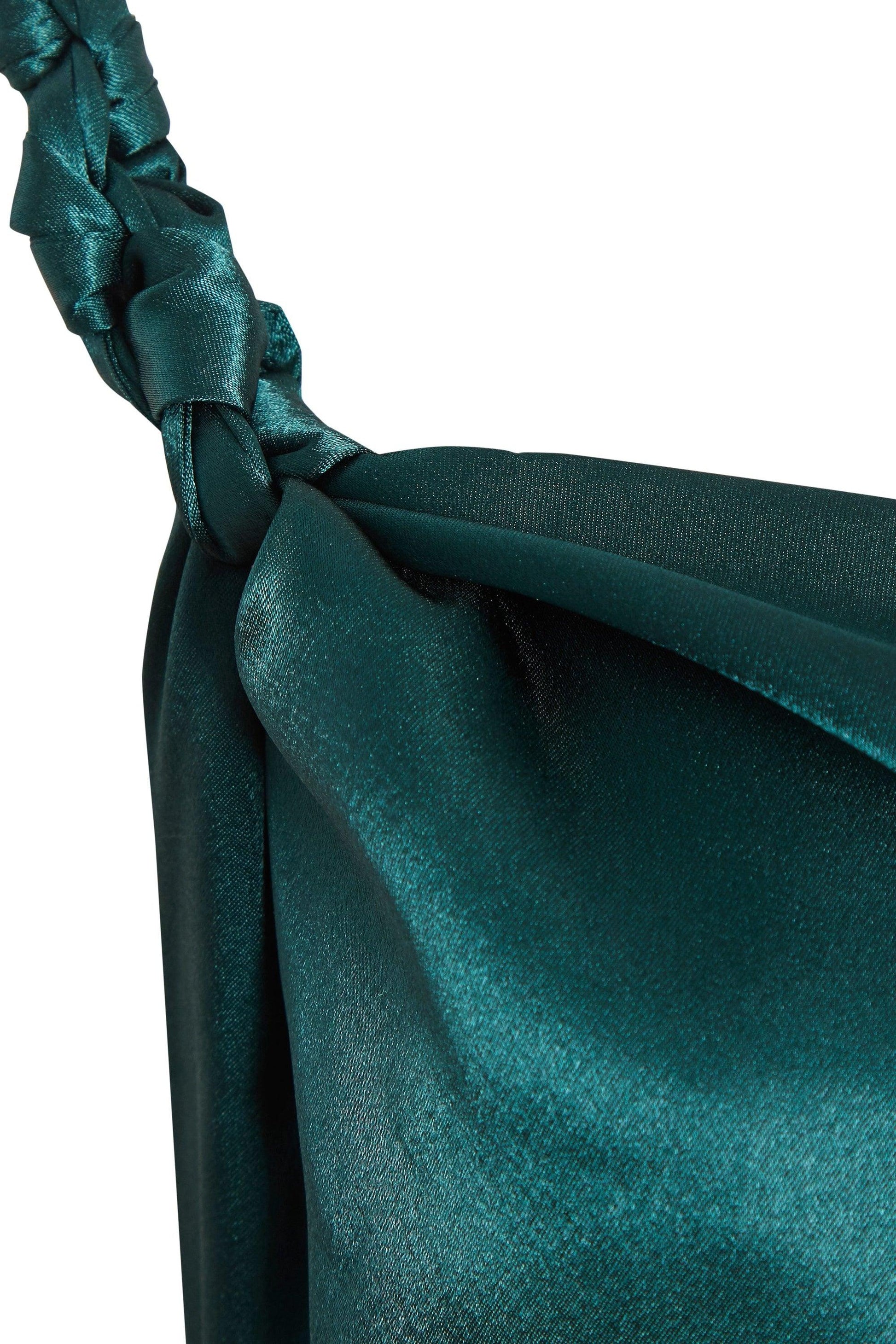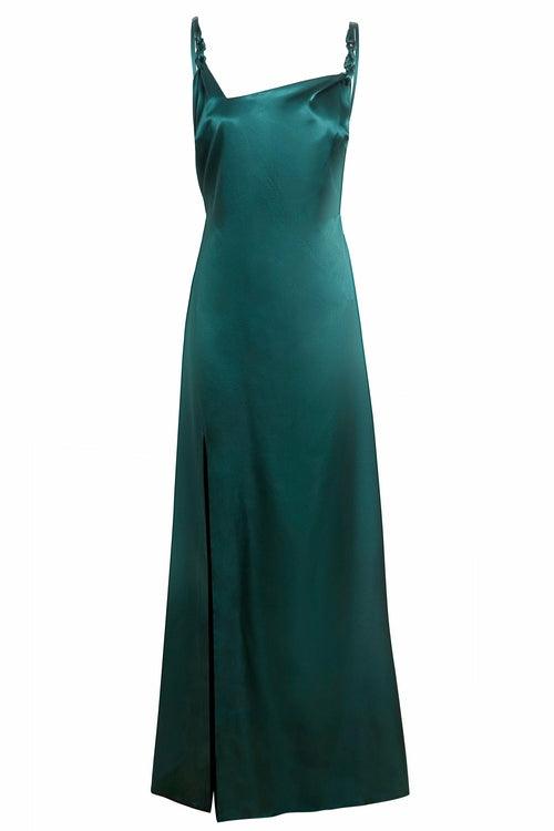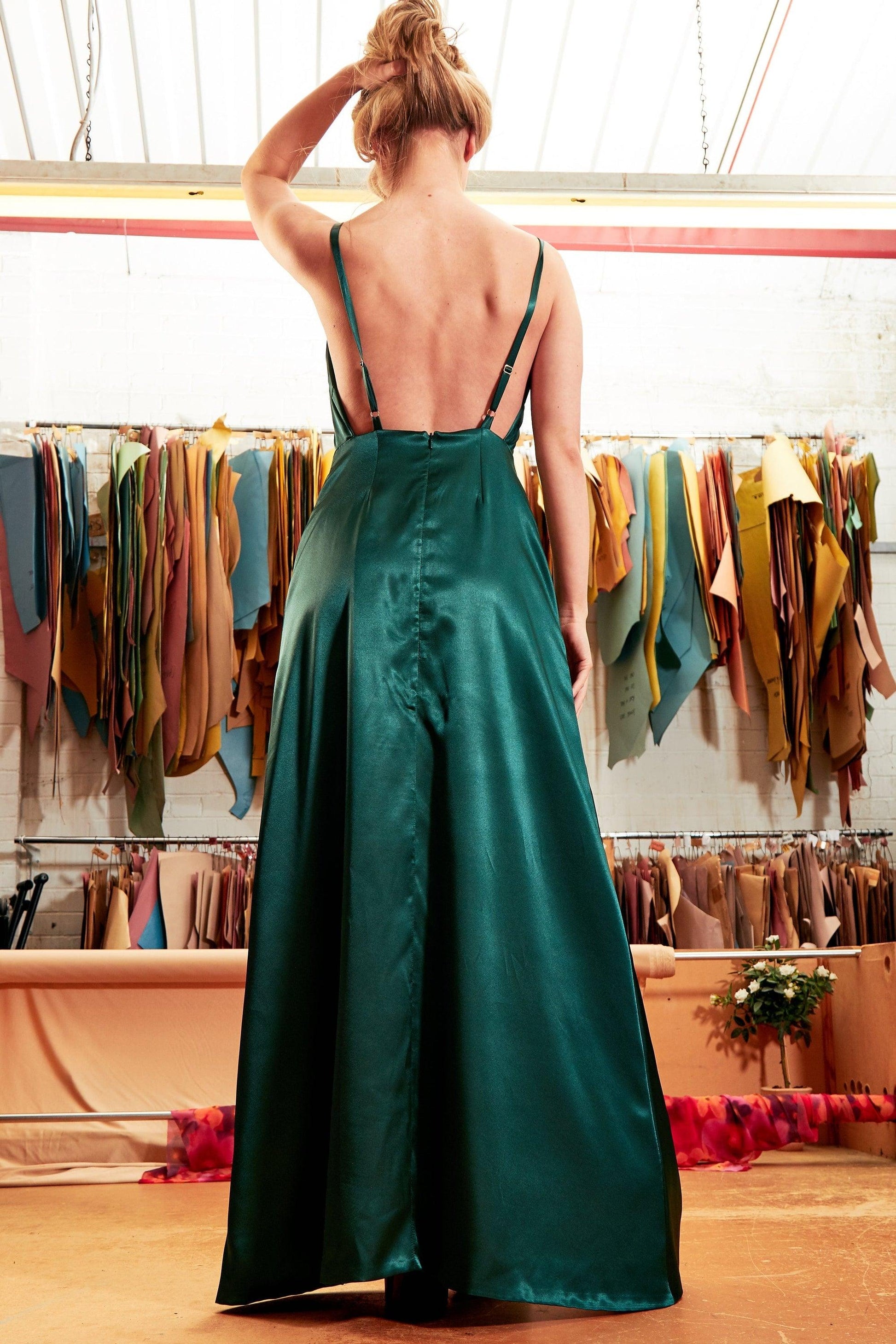 Roya maxi slip dress in emerald green simply oozes an effortlessly elegant look. This emerald green gown is crafted from a slinky and silky satin fabric in a flattering emerald hue. Roya green slip dress is cut to skim across the figure for an ultra-sultry look.
