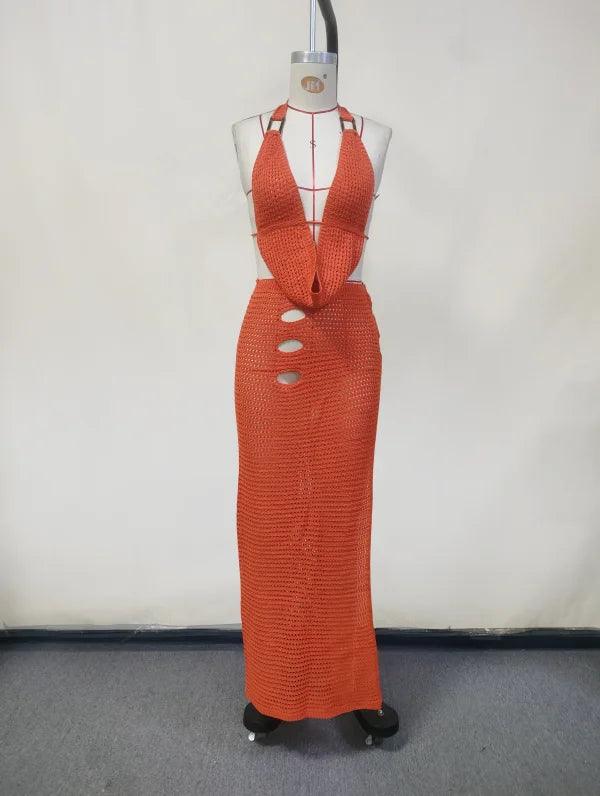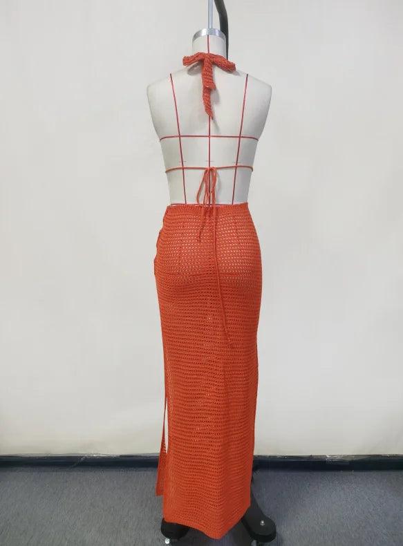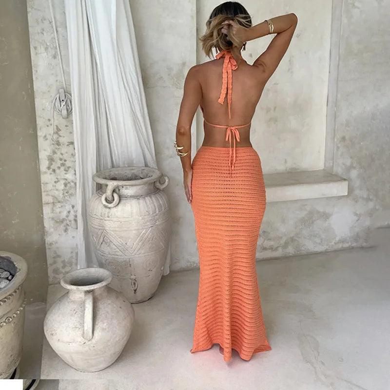 Solid Color Knitted Beach Two Piece Set 2025 Summer Fashion Halter Lace-up
