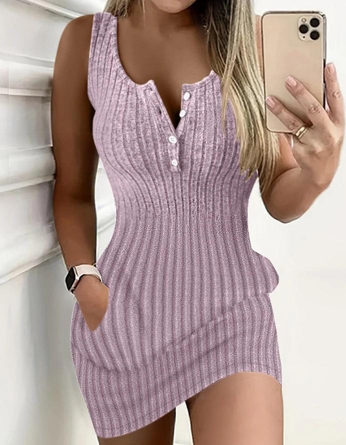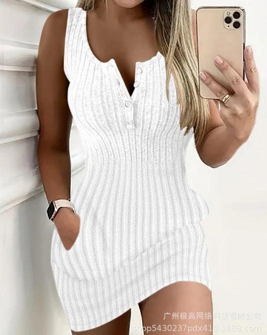 European and American women's clothing 2024 summer new women's casual solid color ribbed pocket design tight fitting dress
