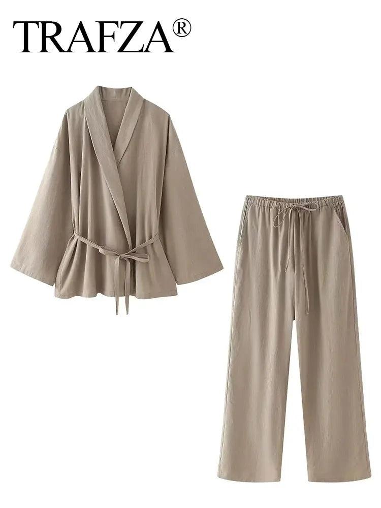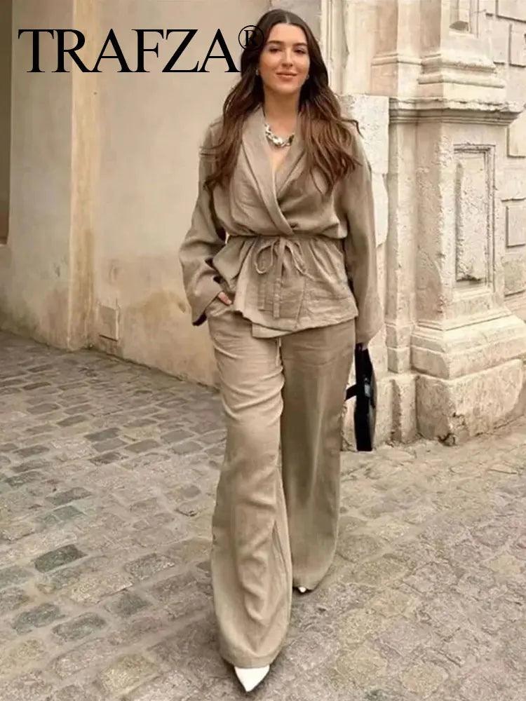 TRAFZA Women Loose Wide Leg Pant Set Fashion Lapel V Neck Long Sleeve Thin Blazer Coat With Belt