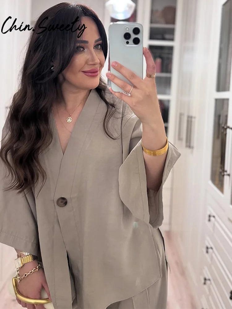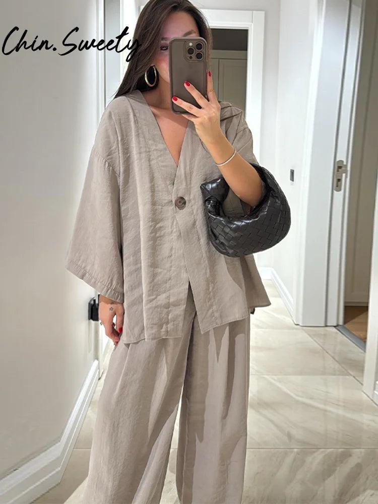 Vintage Cotton Linen Pants Sets Women Elegant Lace UpV-neck