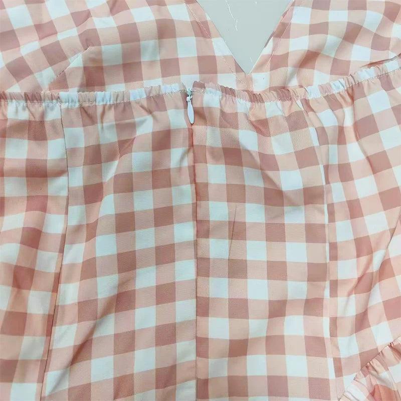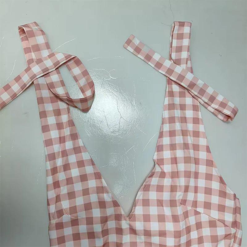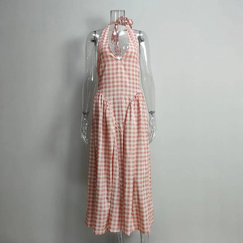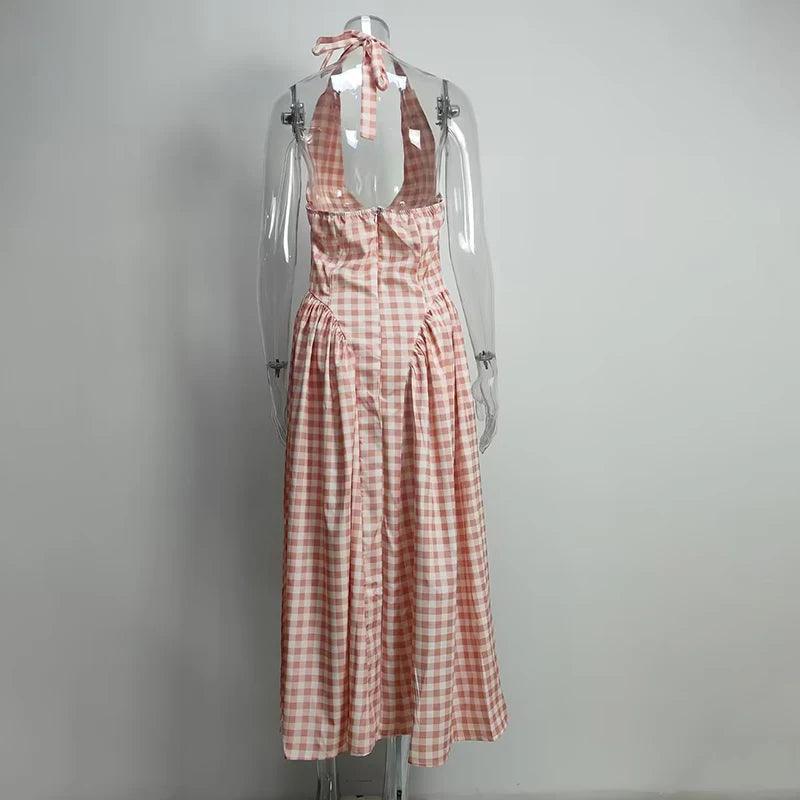 Women Pink Plaid Spliced Halter Lace Up Dress