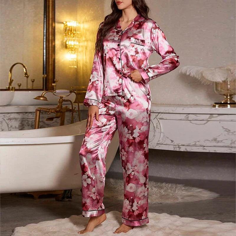 Women's Color-Blocked Floral Print Pajama Set Satin Long Sleeve And Pant For Comfortable Sleep Soft
