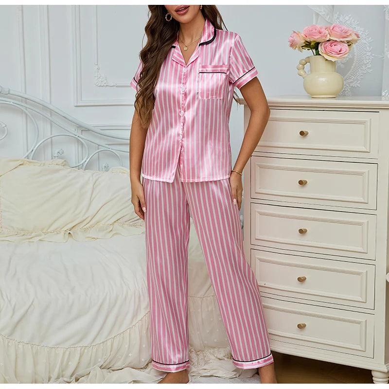 Women's Satin Striped Print Embroidered Pocket Pajama Sets