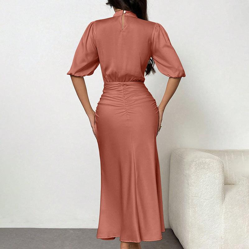 Women's Short Sleeve Mock Neck Ruched Midi Dress – Slim Fit Elegant Party Dress